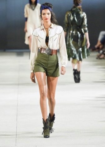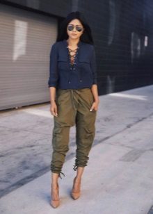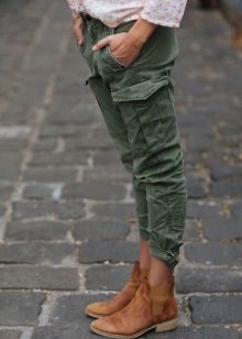 Traditionally, dense and natural materials are used for sewing: cotton, cashmere, suede, leather. But today military-style trousers are sewn from different fabrics and the choice of colors is also unlimited. You can even pick up a model of pink silk or blue denim.