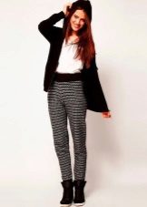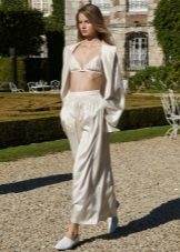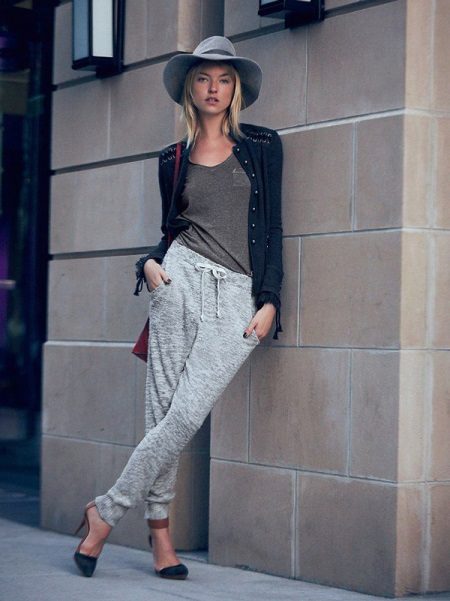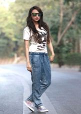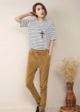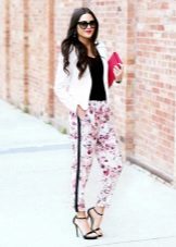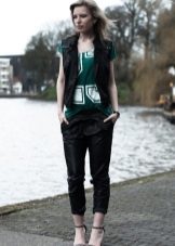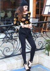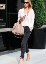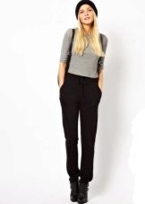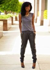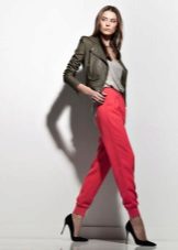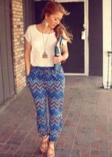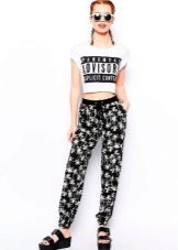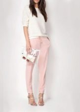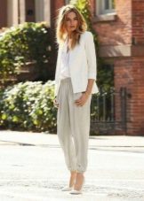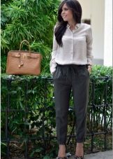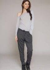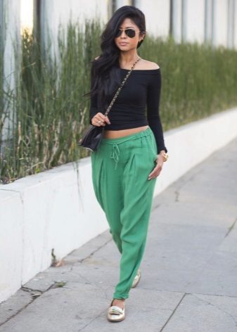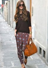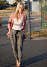 Trousers of loose fit with elastic at the bottom look most impressive and stylish with a neat, concise top. It can be a tight-fitting top or a T-shirt. As shoes, you can pick up graceful boats, moccasins or ballet shoes.
