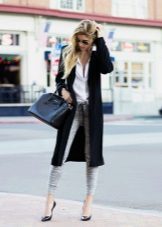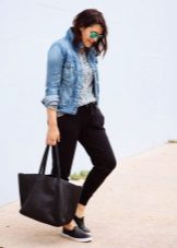 Denim joggers and a free jumper in black and white stripes look very fresh and stylish. A great option for a walk around the city.