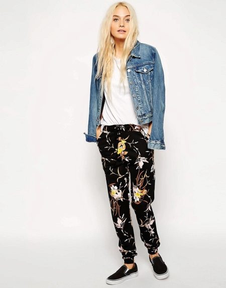 A great option for every day: black printed joggers + white top + denim jacket. Any option on a flat sole is suitable as shoes: sneakers, slip-on shoes, ballet shoes, etc.