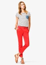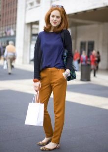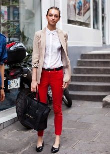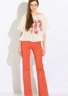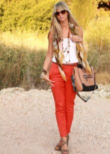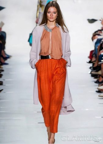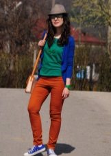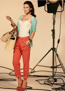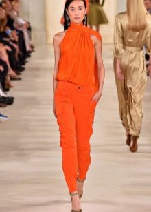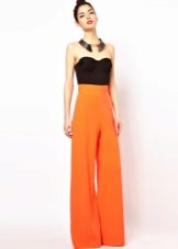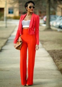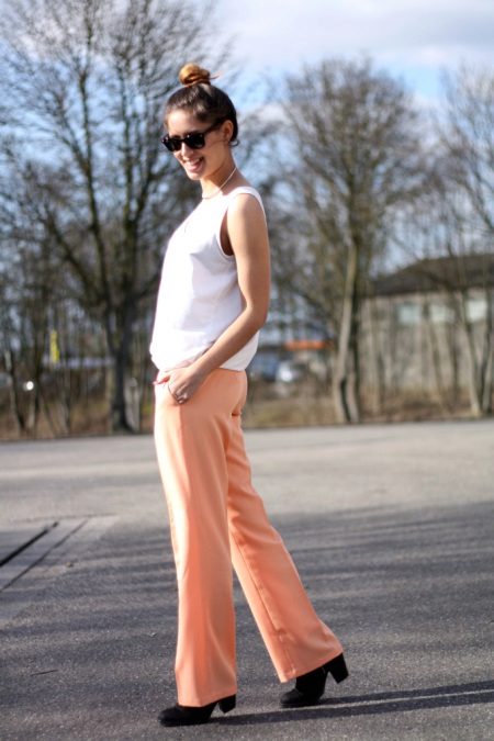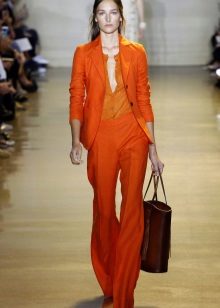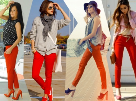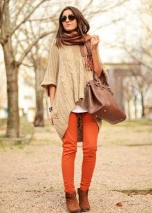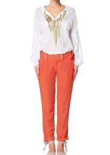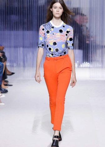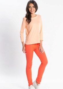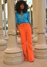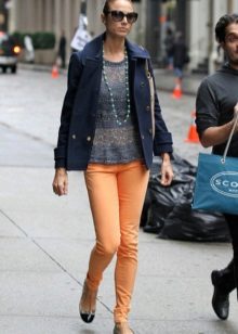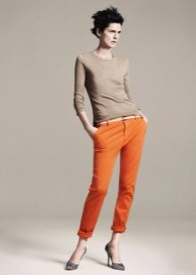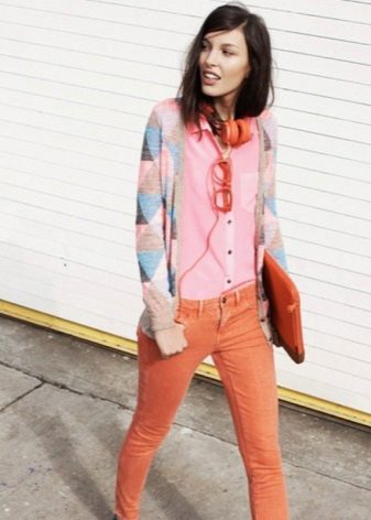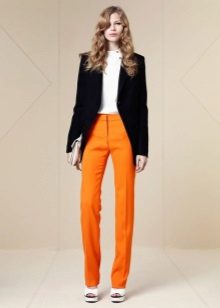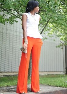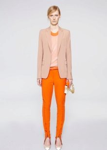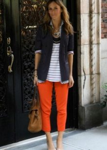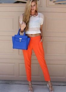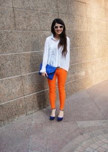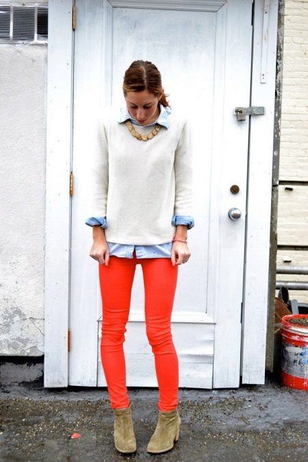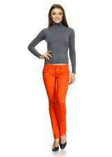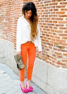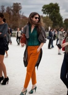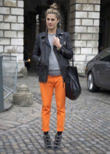 With orange trousers, jackets of white, gray and black color, shortened and elongated style are perfectly combined. A combination with a beige knitted cardigan and a leather jacket-leather jacket are possible.