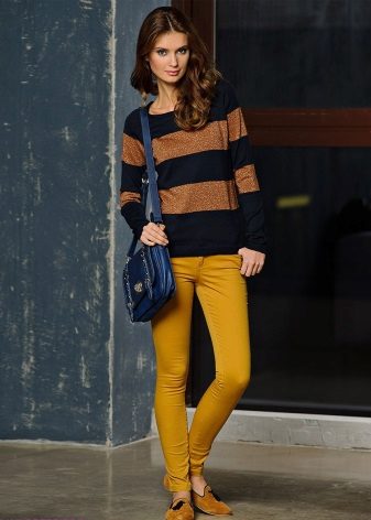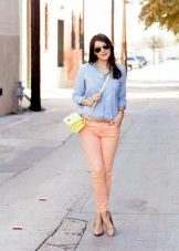 For a casual look, pastel colors are the best choice. Despite the bright trousers, the image will look restrained. Complete with a small bag on a long chain.