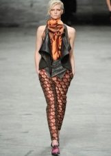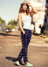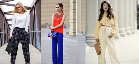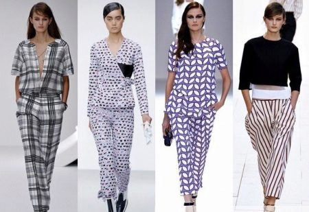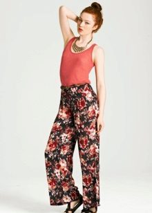 Pajama-style trousers can be found in extremely diverse models: straight and wide from top to bottom, slightly narrowed to the bottom and even completely narrow, fitting the figure. These trousers have an elastic belt or elastic, sometimes only at the back. “Pajama” trousers are tied, as a rule, on laces or, less often, fastened, like usual trousers, with a zipper or a button. The top is chosen according to the model of pajamas.