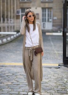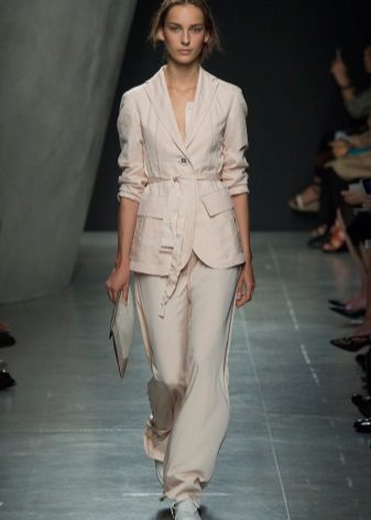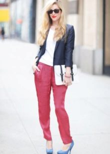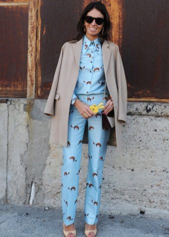 Plain shirt or top tucked into "pajama" trousers of soft colors will give the appearance a business image, and if you include a classic long jacket in this set, you can not hesitate to go to work in this form. Stiletto heels or classic pumps will add elegance to your look. And the coat thrown on top and an invariable clutch will complete the image of a confident business lady.