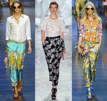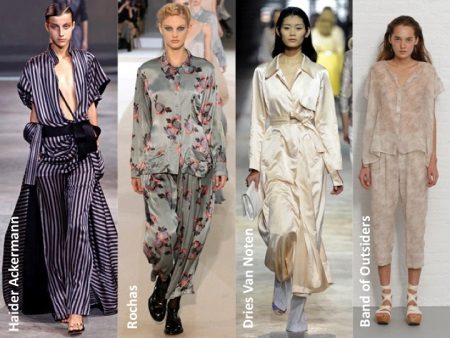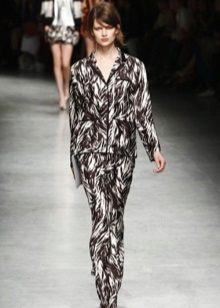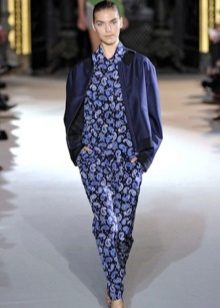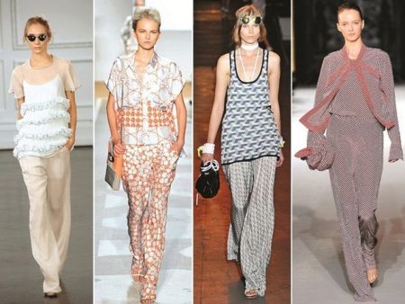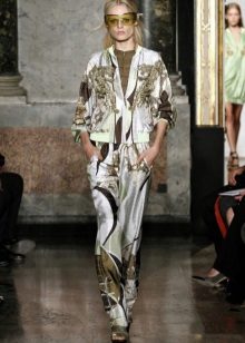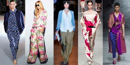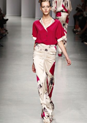 In the latest shows of the collections of famous designers, sets completely imitating pajamas appeared: wide loose pants and a straight spacious shirt, sewn from thick silk or satin, both monochrome and with a print.