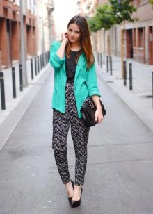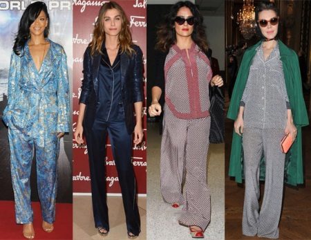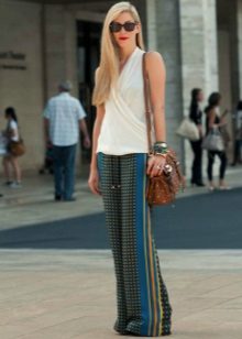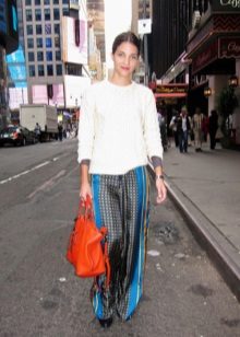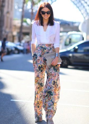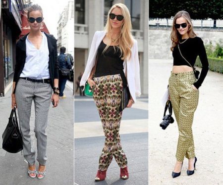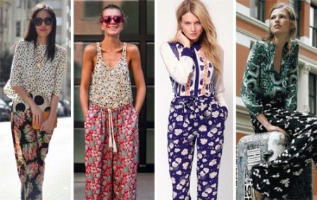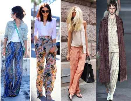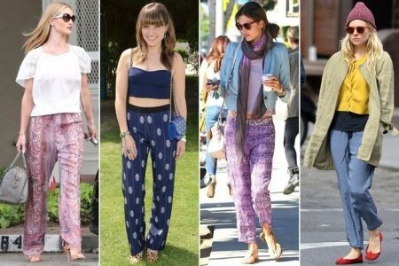 Skinny pajama-style trousers are well combined with a waistcoat, sequin jacket or leather jacket, worn on a plain plain top. Wide floor-length trousers with a bright catchy pattern look good with loose sweaters. In the evening - with beautiful fitted blouses. A satin “pajama” jacket of the same color as trousers will help maintain a glamorous look. An obligatory touch of the evening ensemble is elegant stiletto heels and a spectacular clutch. For a romantic meeting, we recommend choosing cropped trousers, classic ballet shoes and a light blouse made of natural silk.