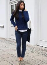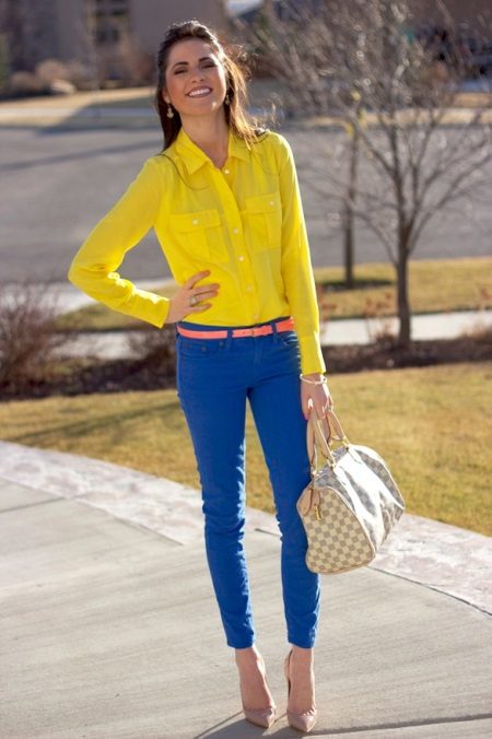 With blue trousers, blouses, t-shirts, blouses and turtlenecks in white, pale blue or yellow will look good.
