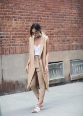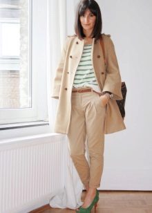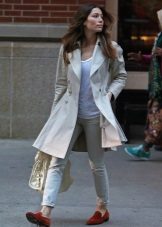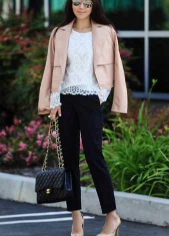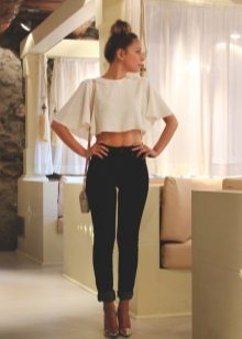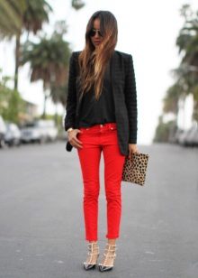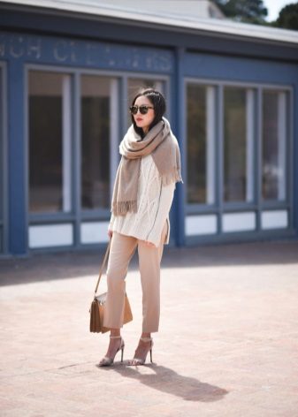 A kit matched in monochrome colors will also look great. Also, the presence of arrows on the trousers and high heels will help to make your legs visually longer and slimmer.
