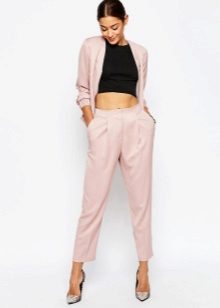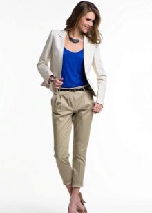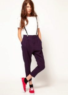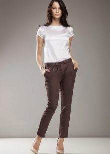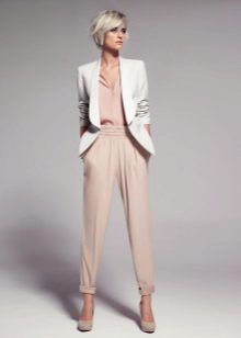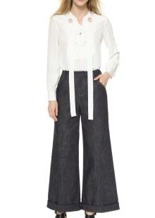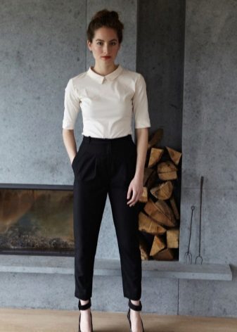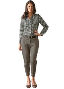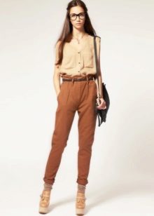 Breeches - it’s tight at the bottom, but rather wide at the hips. At the waist there are many folds that smoothly fall down. Such trousers usually have pockets inside, and they are usually worn with a narrow strap. This style of narrowed trousers suits ladies with wide hips, as their fullness is successfully hidden in folds.