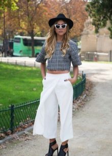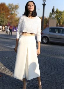 Pantaloons. This model of wide trousers, outwardly similar to a midi skirt, can be almost straight or extended, with a length just below or slightly above the middle of the calf. Looks great only on fashion models, the rest can be advised to try on culottes up to the ankle length or slightly above it.