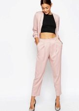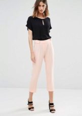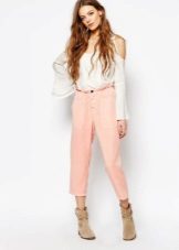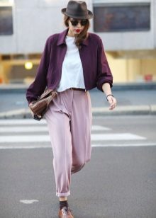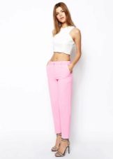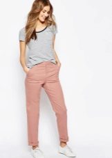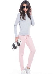 Trousers of pale pink, purple, pastel pink look good in tandem with clothes in gray, white or black. With bright pink trousers, it is better to combine elements of the wardrobe of a beige and brown scale.
