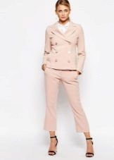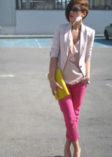 You can pick up the top in pink, but only use different tones. The blouse or jacket should be a tone lighter or darker than the trousers. Blouses made of airy, light fabrics look great.A white bag and shoes will perfectly complement a graceful bow.
