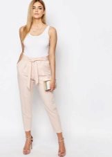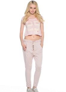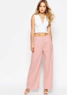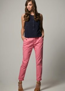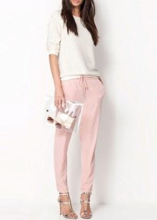 Pink trousers in oriental style look beautiful and fresh. They have much in common with the harem pants and pants of Afghanistan. With this model, a light blouse made of translucent fabric, decorated with a variety of patterns, is beautifully combined.