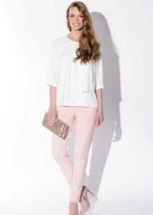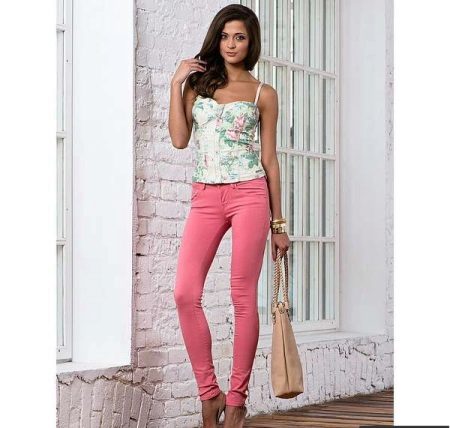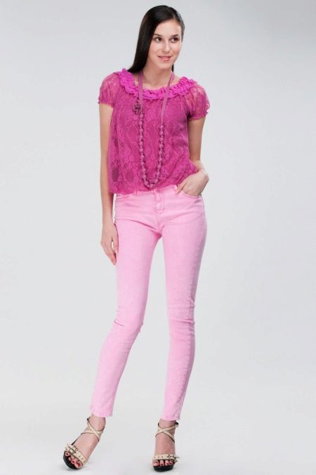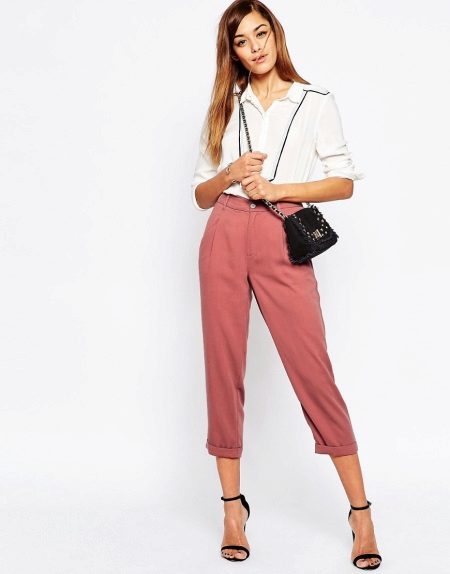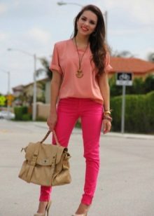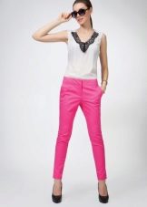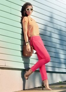 Bright pink trousers always emphasize the creation of the image of a fatal beauty, so the top should not distract attention from the bottom. With pink trousers, light-colored blouses decorated with luxurious accessories can be worn. An elegant necklace, charming earrings, a stylish bracelet will help to give the image of luxury and wealth.