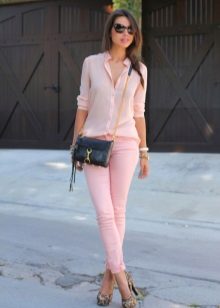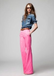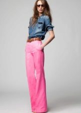 Pink trousers are perfect for embodying stylish bows in a variety of styles. The defining element is the top. Blouses are beautifully combined with trousers. It is worth paying attention to the blue and purple hue. Pink trousers look advantageous with a blouse of pale purple tones, a blouse of bright blue color, even with a denim shirt, which in tandem with a crop top gives an image of sexuality.
