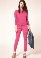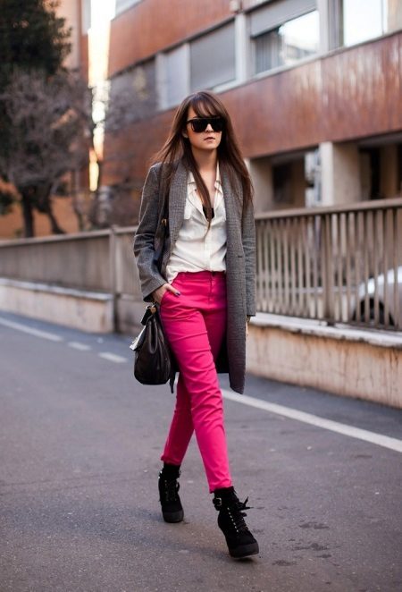 For a casual summer or spring look, pay attention to bright pink pants. Purple color or cyclamen color, fuchsia looks unique and rich. Bright pink models always act as the main emphasis in creating an image, so all other elements of clothing should be in restrained colors.
