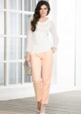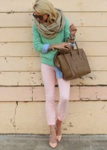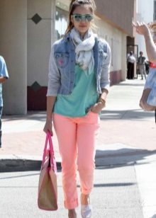 To create a stylish look for every day, peach trousers of a tight-fitting cut in tandem with a cream blouse made of light fabric and a turquoise jacket are ideal. Beige accessories will add completeness: stilettos, an elegant handbag on a chain and an exquisite belt.
