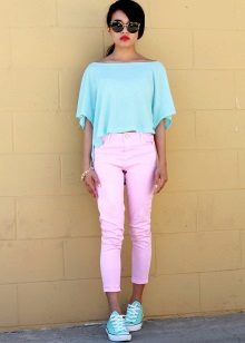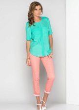 A combination of pink and turquoise looks very elegant and harmonious. With pink trousers, you can wear a turquoise tunic or a blouse, but shoes are better to choose black.
