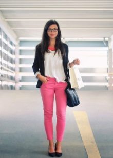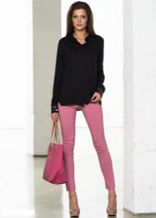 Pink trousers look beautiful and spectacular in tandem with a black shirt or top. An excellent solution is a light blouse and a jacket over a dark color. To look attractive, you should combine pink with white and black.