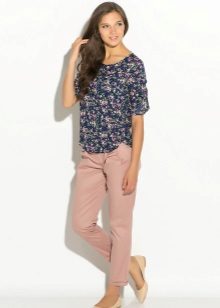 Pink pants can be combined with a tunic or T-shirt, decorated with a floral print. The color of the shoes should be matched to the color of the top. For example, with a gray shirt, you should wear pumps or gray ballet flats.