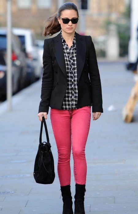 Pink color goes well with black. Dress in a black and white check shirt for a classic style in pink pants. You can throw a black jacket on top. Boots and an elegant bag that matches the suit of your jacket will perfectly complement your unique look.