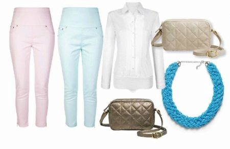 Pink trousers will fit perfectly in a tandem with a light blouse and white sandals. To look romantic and feminine, pink pants should be worn with a bluish-green blouse.