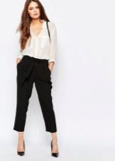 If the trousers perform a corrective task, then you can pick up a fluffy blouse or a loose-fitting shirt to them. A wide belt will emphasize the waist, and a free cut will distract attention from extra centimeters in the abdomen or hips. High-heeled shoes will make your look brighter, and flat shoes will give the kit a more informal and free look.