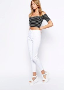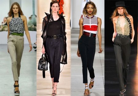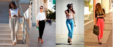 In the hot season, you can choose a bright T-shirt, a multi-colored T-shirt or a beautiful top for trousers with a high rise. Sandals on a high platform or heel, light sandals, ballet shoes, etc. are suitable as shoes.