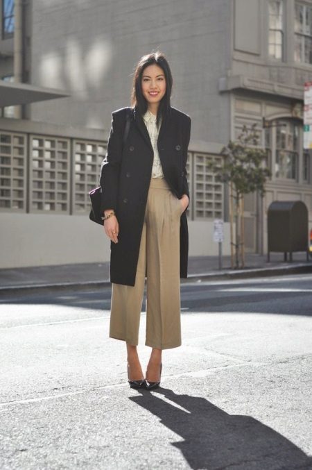 A very interesting set is made up of cropped light beige wide pants, a light top with a soft print and a black coat of men's cut. Stylish and non-trivial option for every day.