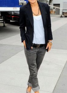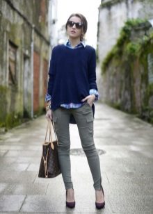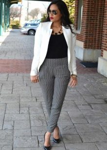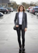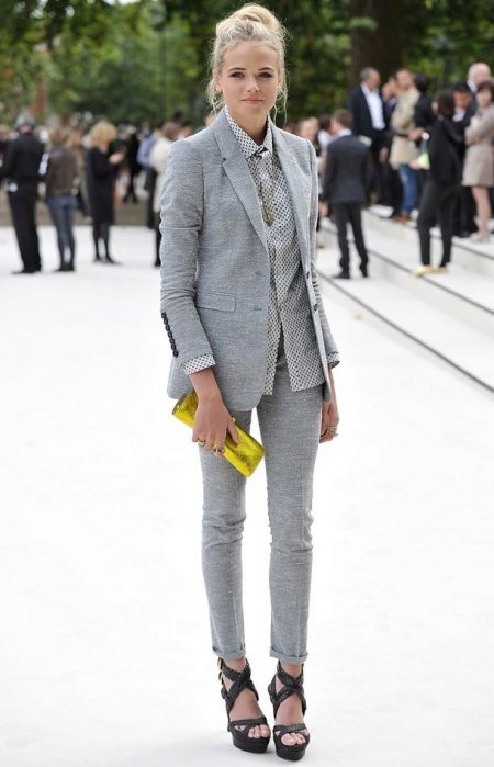 If you don’t have to wear a formal business suit for visiting the office, you can choose less formal sets. For example, gray skinny pants combined with a floral blouse. In this ensemble, it is quite possible to include discreet jewelry and several accessories.