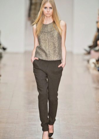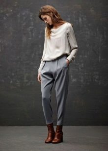 Arrows on trousers - an eternal classic, bright representatives of office and business style. This model is better to wear to work. The main advantage of gray trousers with arrows is that they suit all women without exception and are combined with many types of blouses, sweaters and cardigans.