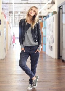 Outfit for walking. What is needed for a city promenade to be successful? Correct - comfortable and comfortable clothes. And, the best possible way, gray skinny pants or skinny jeans will fit in the street style. They go well with sweatshirts, over size sweaters, leather jackets or suede jackets, and T-shirts. From shoes, ordinary sneakers, slip-on shoes, loafers, moccasins will fit into the image, in general, everything that is convenient to wear over long distances. You don’t need a lot of accessories - just a bag over your shoulder, if you want extravagance - a cap or a hat.
