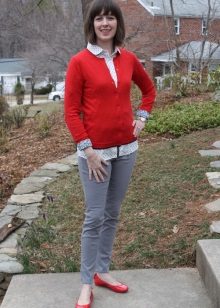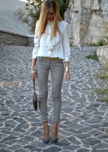 With a flared trouser model, blouses with a spongy V-neck are very effectively combined, and they can be not only white. From shoes with such a set, you can pick up stilettos and simple boats. Such combinations once again prove that gray trousers in the office are not at all boring!