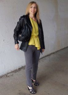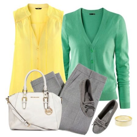 An image with a bright top. Yellow and green colors are perfectly combined with each other, and gray trousers dilute and balance them. In this look, flat shoes are loafers, they can be replaced with ballet shoes of the same neutral tone. As for accessories, there is moderation - a bag and a massive bracelet are enough.