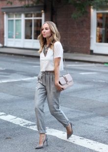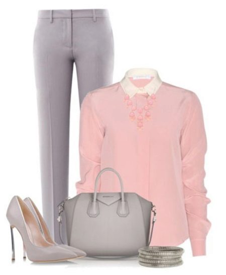 Image for a date. For this event, gray trousers look with a top of delicate shades - pink, mint, cream, peach. Any top or blouse with frills, ruffles or ruffles will create a romantic mood. From accessories it is worth paying attention to a small clutch and high-heeled shoes.