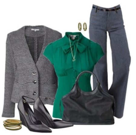 A classic business look with a combination of a bright top and a dark bottom. Gray is in harmony with green, and the bow on the blouse makes the image a little flirty, thereby diluting excessive rigor. There is also a business approach in accessories - a black and gray bag, high wedge shoes, an impeccably selected set of jewelry.