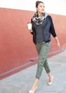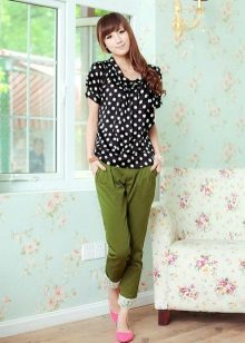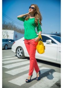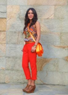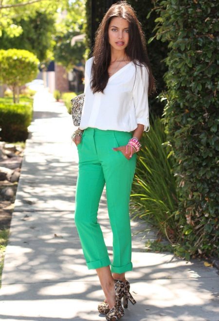 In summer, trousers of bright colors are good - yellow, green, blue, with prints and ornaments. Adding to them the usual T-shirt or T-shirt, sandals and sunglasses, you can go for a walk around the city.