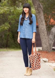 Great bow in a casual style. Muted gray trousers with geometric patterns, a blue shirt, boots create an outfit for study.