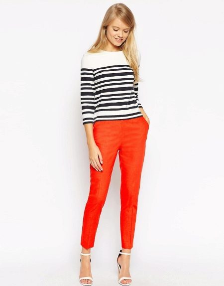 A bright accent of the bow is orange trousers. Everything else should be neutral tones - a white striped sweater and white sandals. Such a set is appropriate both for a walk and for a trip with friends in a cafe.