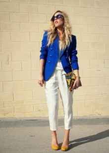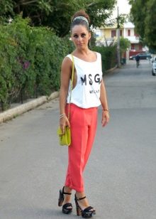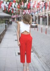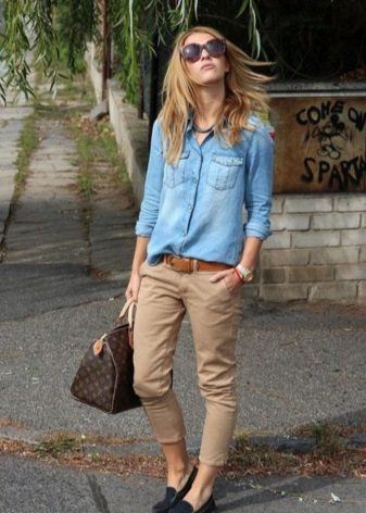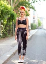 For girls who want to look romantic on a hot summer day, cropped slacks with arrows and a dark blue high waist are perfect. A shirt on the shoulders of light blue in a thin strip, tucked in, will look great with this model of trousers. Elegant black low-heeled boats will complement the look.