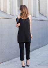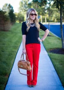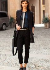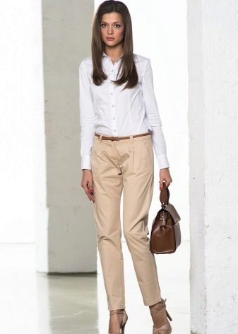 A stylish combination in a women's business attire will be black slacks with arrows and a white knitted blouse that fits the figure and emphasizes its advantages. Stylish low-heeled shoes, a strict belt and a classic handbag complement the look.