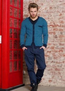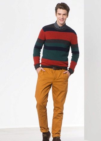 For girls, as a daily ensemble, slacks of loose cut light cornflower blue color are perfect, combined with a light light gray sweater, the knitting of which imitates small ripples. For a man, mustard-colored slacks are very suitable in combination with a dark gray shirt. Over the shirt you can wear a sweater in gray, blue, green and red wide stripes. Round off this look with stylish brown suede boots.