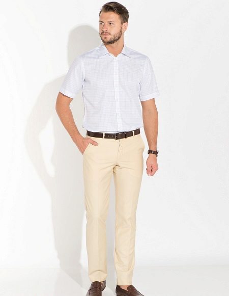 For men, a good summer option would be ivory slacks, in combination with a white shirt in a shallow blue check. Complement your look with brown shoes, a belt and a watch.