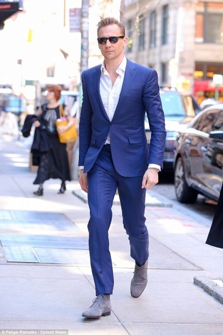 For men, a blue three-piece suit, consisting of stylish slacks trousers tucked from the bottom, a vest and a jacket, can become an actual option. You can complement this combination with a white or light blue shirt, which can be either plain or with an unobtrusive print in a small square.