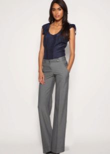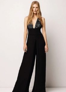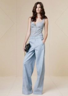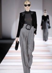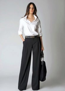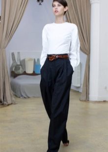 Wide trousers look especially good with a top that exposes the arms, back and shoulders. If the figure allows, you can put on a shortened model that will demonstrate to others your flat tummy. This is called a game of contrasts, wide baggy trousers and a stylish tight-fitting top look very interesting. To make your look very concise, complement it with interesting accessories.