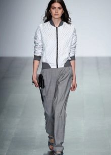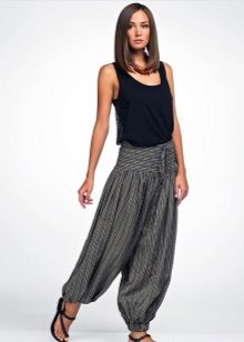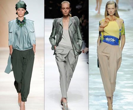 Wide trousers in oriental style, which are collected on the ankle with a wide or narrow cuff. Often they have a low armhole, so they look very interesting and unusual. These are also oval-shaped pants that are only suitable for slim girls. Despite the fact that they perfectly hide the flaws of the figure, they also add a few extra pounds.