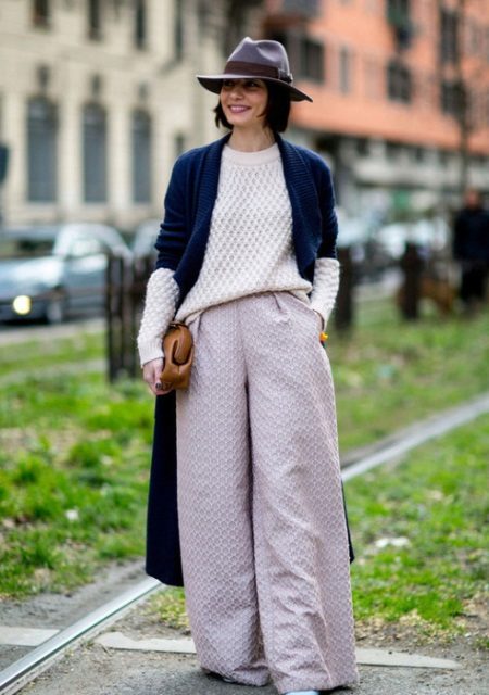 A bold look for every day for real fashionistas! Light gray palazzo trousers in combination with a voluminous white sweater and a long blue cardigan look very interesting and unusual. It is complemented by a small brown handbag and a stylish gray hat. In this case, the girl chose sandals, but it is better to give preference to sneakers in a sports style, loafers or oxfords.