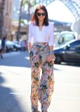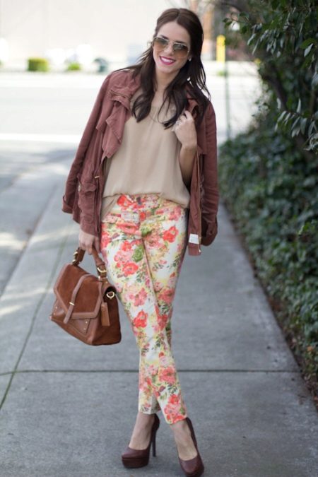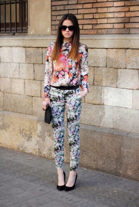 And finally, bright flowers. Do not think about inappropriate. Let the bright top or blouse match the flowers on the trousers. Do not be afraid to choose such kits!