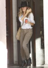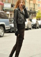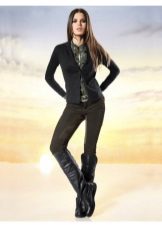 Finally, the sexiest image, which will make an unforgettable impression - will not remain indifferent! With light brown skinny trousers, you can wear a black top with a neckline and put on a black leather bunny top, and stiletto ankle boots are put on your feet. Such an outfit will turn out to be fatal, passionate and very stylish, of course, if you have something to show.