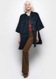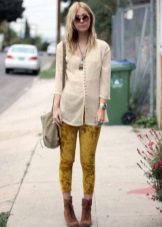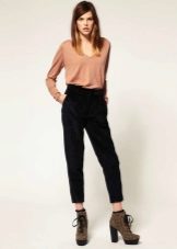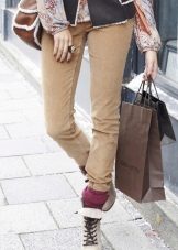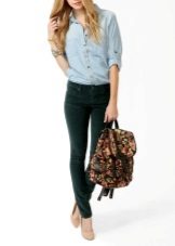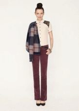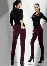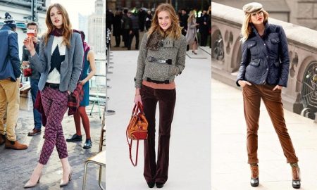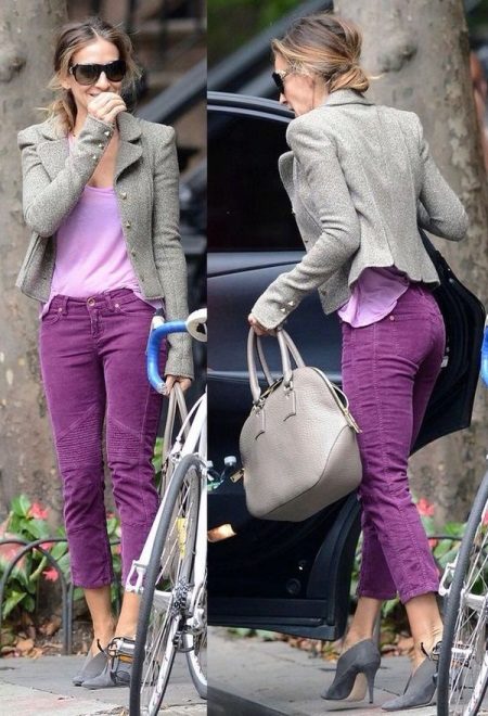 Bright models of trousers will suit young girls who are not afraid to attract attention to themselves. Purple tight corduroy trousers will go with a lilac t-shirt, and the playfulness of the image will help to “calm” a strict gray jacket, a voluminous bag and suede ankle boots with the same color.